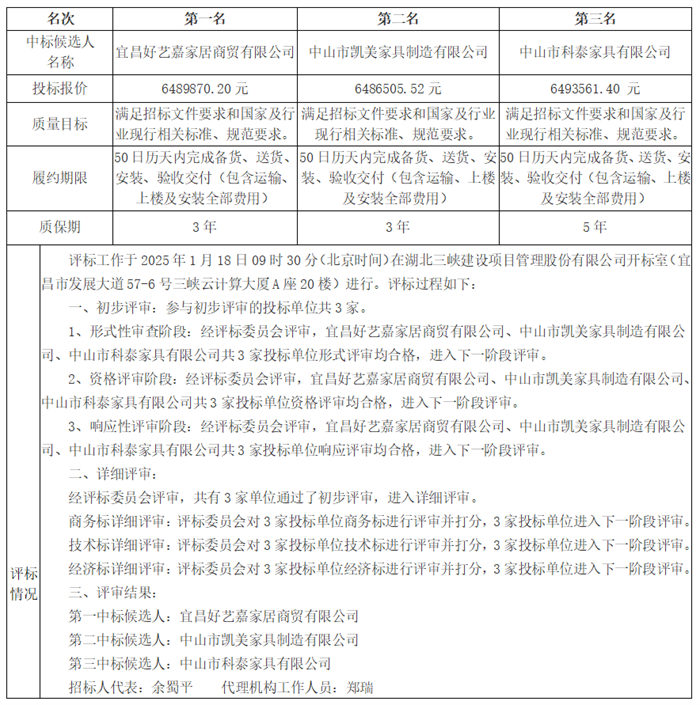 標(biāo)段(包)編號(hào):SXJS-CGZB-2024-151 一、招標(biāo)概況 地建青年安居項(xiàng)目家具家電招標(biāo)項(xiàng)目于2025年1月18日09時(shí)30分在湖北三峽建設(shè)項(xiàng)目管理股份有限公司開標(biāo)室(宜昌市發(fā)展大道57-6號(hào)三峽云計(jì)算大廈A座20樓)開標(biāo)、評(píng)標(biāo),根據(jù)評(píng)標(biāo)委員會(huì)提交的評(píng)標(biāo)報(bào)告,現(xiàn)將中標(biāo)候選人公示如下: 二、評(píng)標(biāo)結(jié)果