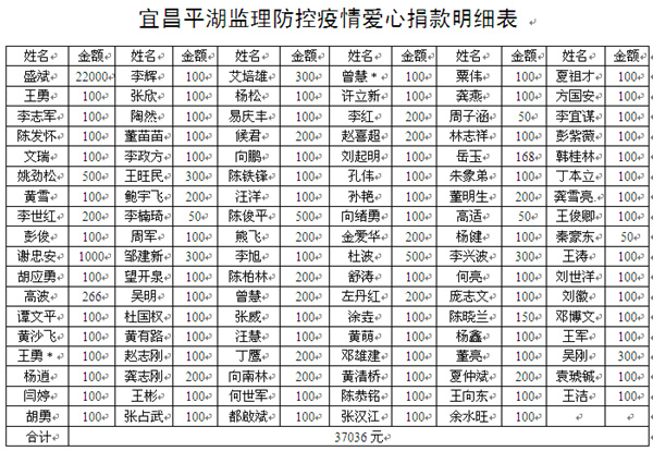 突發(fā)的新型冠狀病毒感染肺炎疫情牽動(dòng)著黨中央和全國(guó)人民的心,全國(guó)各地已啟動(dòng)突發(fā)公共衛(wèi)生事件Ⅰ級(jí)響應(yīng),各部門、各行業(yè)積極行動(dòng),投身到抗擊疫情的第一線。團(tuán)結(jié)一心、眾志成城,堅(jiān)定不移打贏這場(chǎng)無(wú)硝煙的抗疫之戰(zhàn),已全面進(jìn)入決戰(zhàn)時(shí)段。 春風(fēng)楊柳萬(wàn)千條,六億神州盡舜堯”,抗擊疫情平湖有責(zé)。我們雖不是白衣天使,不能做到義無(wú)反顧奔赴前線抗擊疫情,但我們能夠情系前線,獻(xiàn)出我們的一份愛(ài)。公司黨支部號(hào)召全體員工弘揚(yáng)守望相助精神,積極行動(dòng)捐款援助,用善舉彰顯平湖監(jiān)理人的責(zé)任擔(dān)當(dāng),同呼吸、共命運(yùn)、心連心,為決勝疫情做出積極的貢獻(xiàn)! 由于疫情嚴(yán)重,公司取消節(jié)后面簽報(bào)到,用愛(ài)國(guó)捐款的方式,在堅(jiān)定支持抗擊疫情中報(bào)到。以信念備戰(zhàn),用愛(ài)心參與,為勝利助力! 2月8日我公司黨支部發(fā)起的愛(ài)心捐款,短短3個(gè)小時(shí),108位同事踴躍參與,奉獻(xiàn)善款17036元。加上公司總經(jīng)理1月26日捐款10000元、1月28日捐款10000元,我公司參與抗疫共計(jì)捐助37036元。愛(ài)心還將持續(xù)。